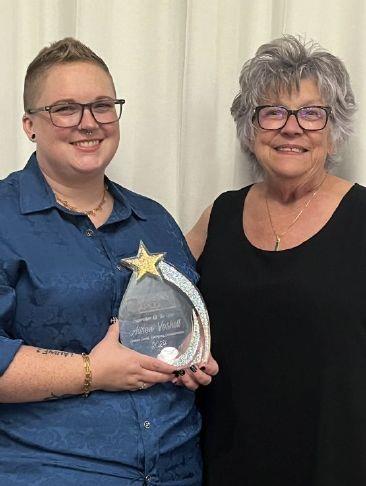 Kansas APCO Line Supervisor of the Year award winner Alison Voshell celebrates with her grandmother, Jane Tuttle.